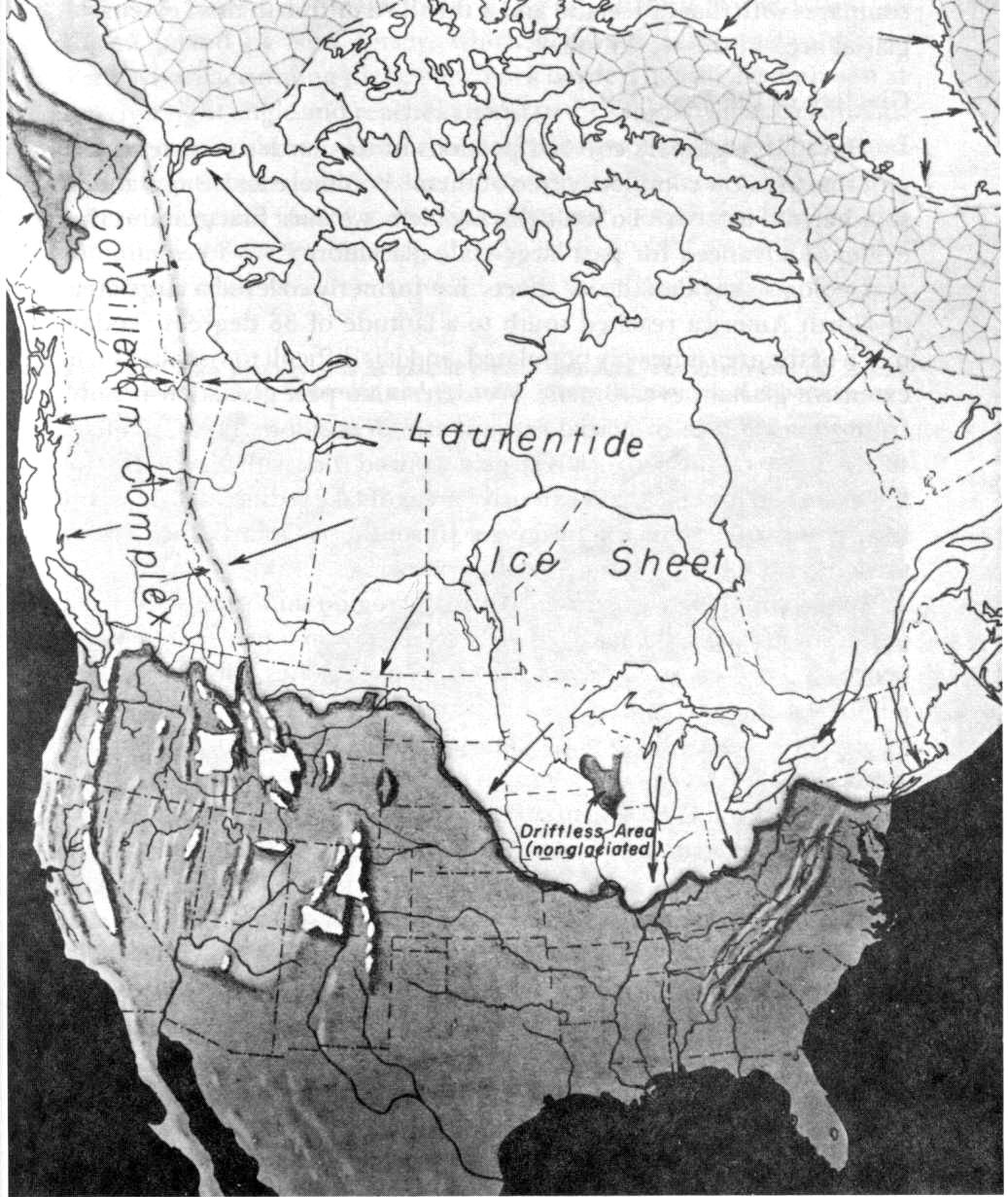 Glaciers once covered all of Canada and a substantial part of the United States. The glaciated areas of the U.S. include New England, as far south as northern New Jersey and northeastern Pennsylvania, and the Midwest, including most of Wisconsin, Illinois, Indiana, Ohio, and Missouri, and all of Minnesota, Michigan, and Iowa. The ice sheet extended west, covering parts of North and South Dakota and the northern edges of Montana, Idaho, and Washington.