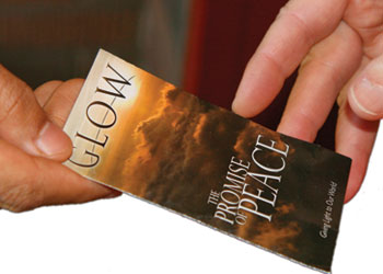 I decided to wait awhile and see how fast the line was moving, and sat down on a ledge just outside the front window. I was about to get out some papers to grade when the Holy Spirit reminded me about the GLOW tracts in my backpack and I felt impressed to give one to a lady sitting nearby.