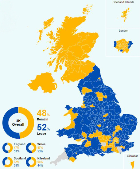 A third map is of the UK Brexit vote. Once again, a sharp division, and once again with a ‘character’ of its own. If you ignore Scotland for a moment, what you see is blue=poor and yellow=rich. Broad strokes, I know, but we've been doing that with the first two maps too. There are only a few pockets of yellow=rich=remain. But yeah, fewer people live there. Same thing as in the US and France.