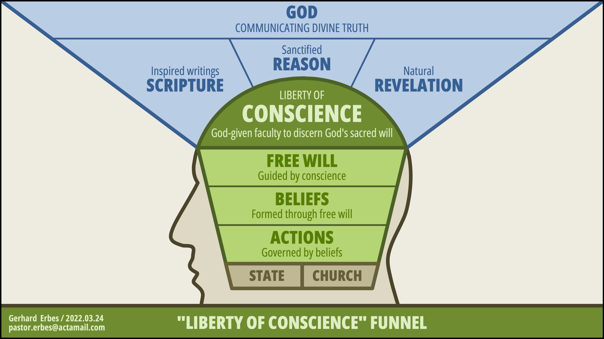 "Liberty of conscience" is only possible when man can freely communicate with God, and the Holy Spirit can interact with conscience through channels like inspired writings, sanctified reason, and natural revelation. Where the sacred ground of divine-human interaction within conscience is protected, there is liberty of conscience. This liberty is at the very center of man. Even deeper than "free will". While free will is the ability to choose, it still must be guided in its decisions. Conscience is that guide, but it can operate properly only when liberty of conscience is granted. As free will is guided by conscience, it forms "beliefs". These beliefs govern the "actions" taken. Liberty of conscience is like a funnel, from top to bottom, from divine truth down to human action, with conscience at the epicenter. Authorities such as church and state are subordinate to a divinely guided conscience and should defend liberty of conscience. See Illustration #1: "Liberty of Conscience Funnel".