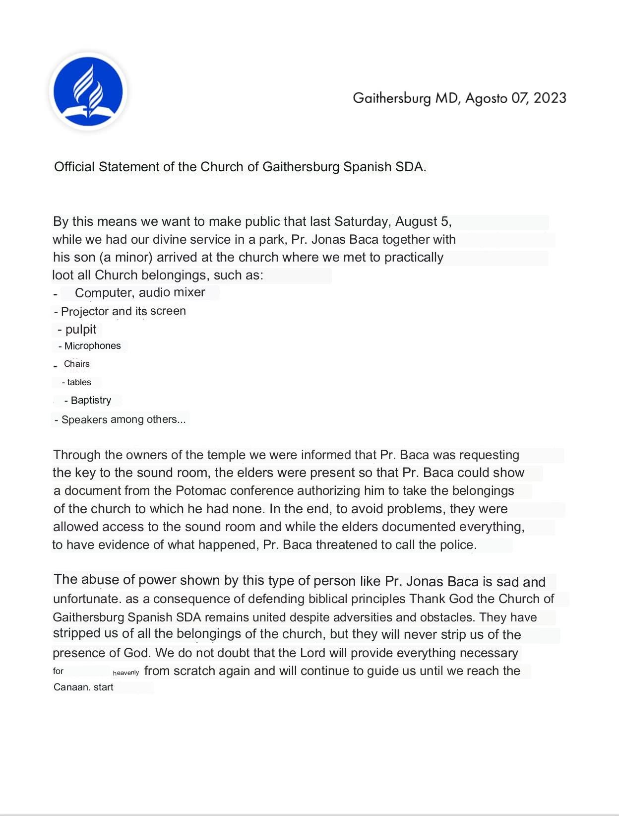 The elders of the Church asked the pastor for a document from the Potomac Conference stating that he had their permission to ‘loot’ the church building. According to the Gaithersburg Church Statement, he did not have such a document.