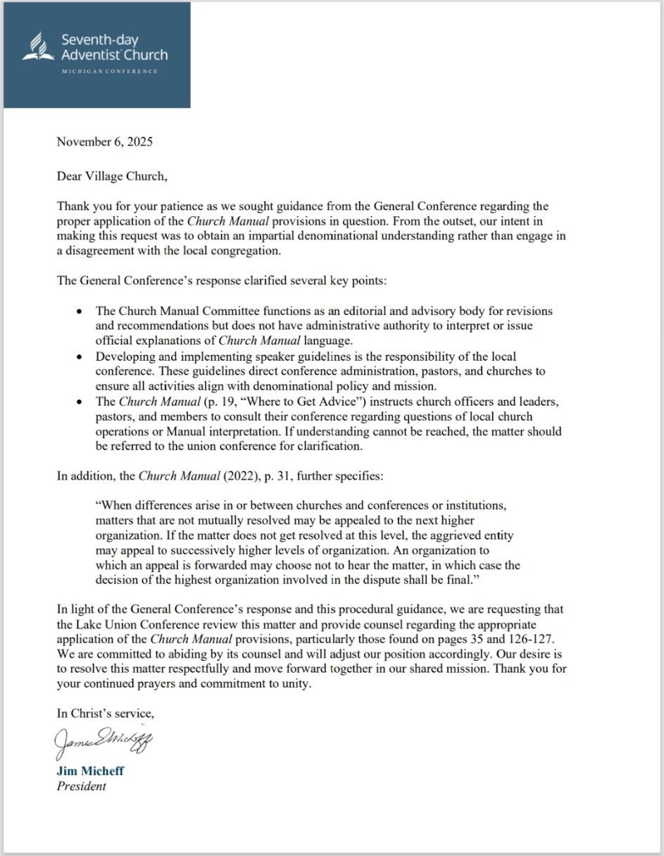 Upon learning of the business meeting outcome, Jim Micheff sent a letter to the General Conference, asking the Church Manual Committee to weigh in on the decision by Michigan Conference to ban Conrad Vine from speaking in any pulpit in Michigan. They were asking for the GC to give them permission to override a duly called church business meeting who voted to support a duly elected church elder and member in good standing.