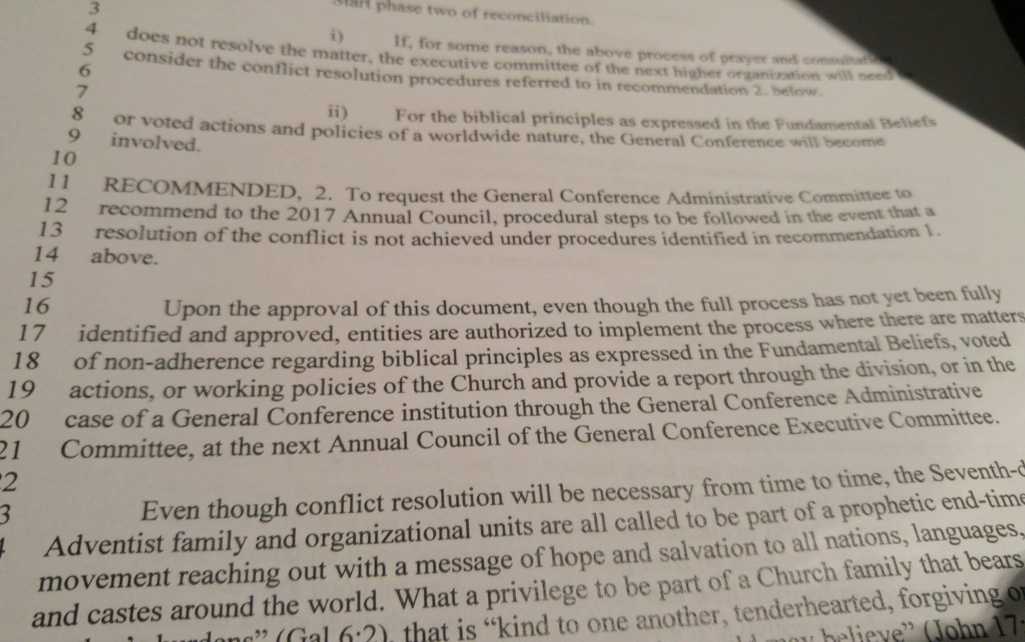 - Those opposed to document seem to be describing it as if the church leaders are forcing this down delegate's throats as opposed to reconciliation