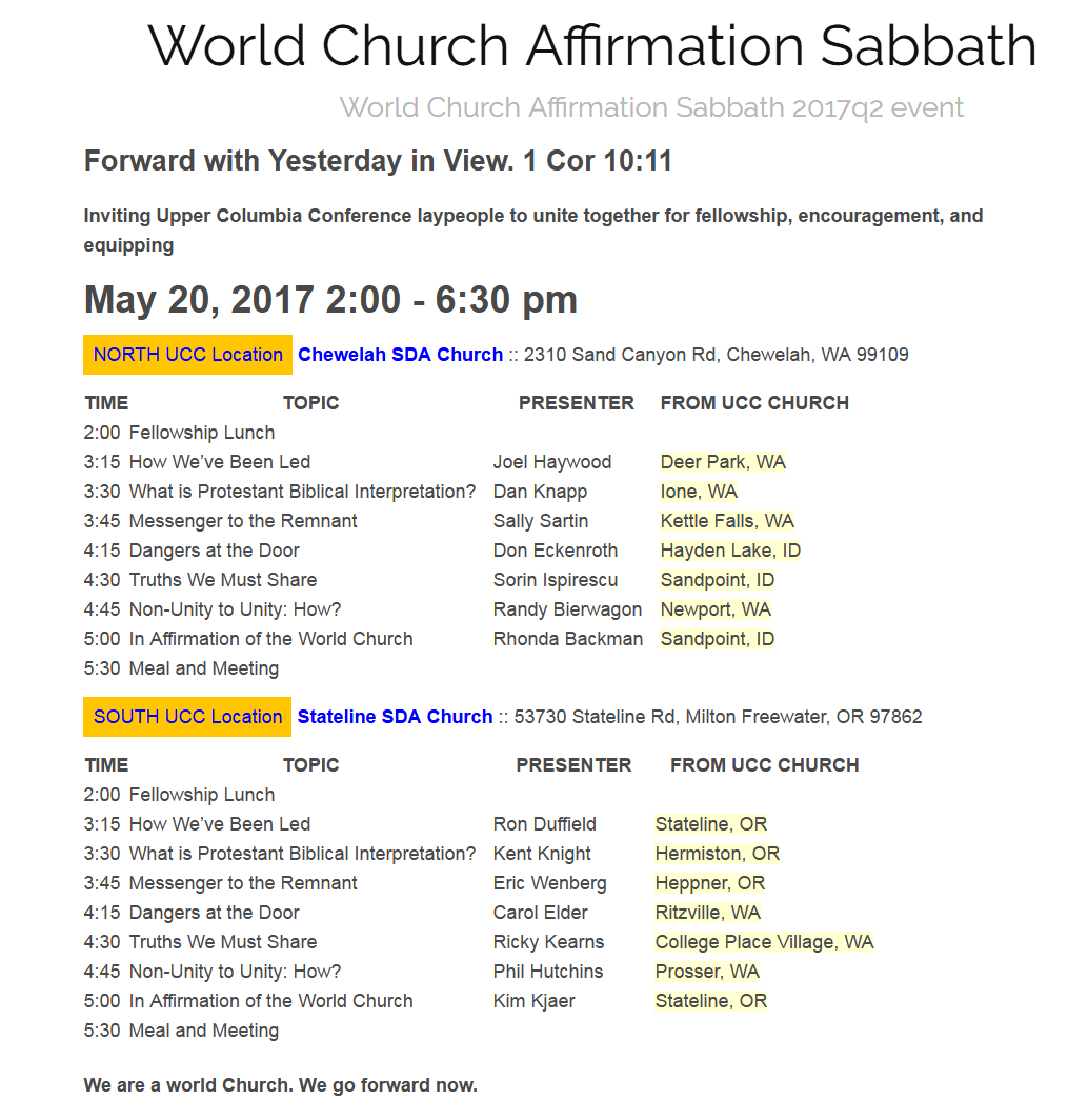 A meeting affirming support for the Worldwide Seventh-day Adventist Church will take place in the Upper Columbia Conference on May 20, 2017. Make plans to attend!