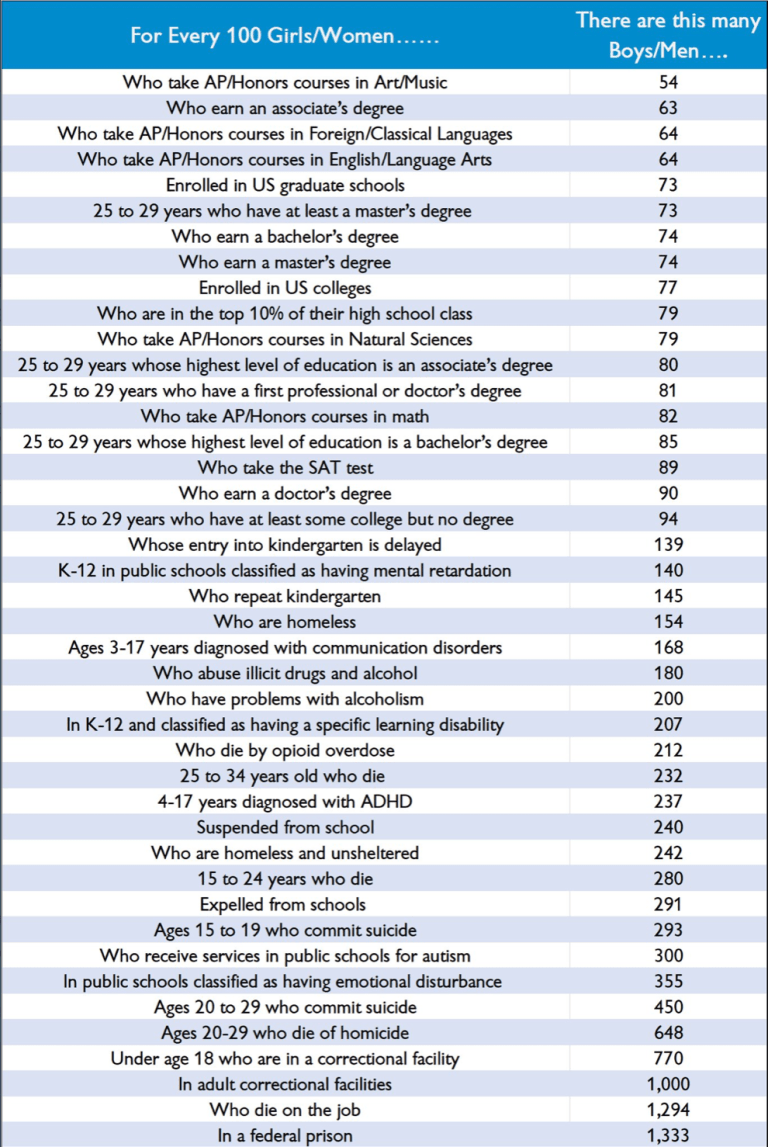 Men are also way over-represented in autism, ADHD, drug abuse, suicide, crime, and incarceration. We covered the plight of men in today’s America here. Suffice it to say that being a male in today’s America is no picnic. It is time to stop pretending that girls in America are an oppressed, outraged “minority,” and start worrying about what is happening to the male sex.