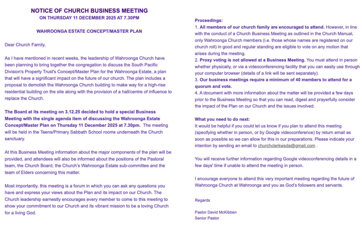 The leadership of Wahroonga Church are bringing together the congregation to discuss the South Pacific Division’s Property Trust’s Concept/Master Plan for the Wahroonga Estate, a plan that will have a significant impact on the future of our church and its mission. The plan includes a proposal to demolish the Wahroonga Church building to make way for a high-rise residential building. Facebook Link.