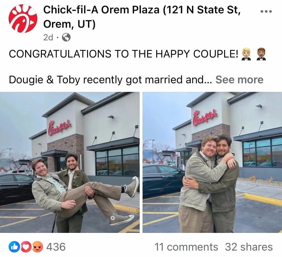 A Chick-Fil-A restaurant in Orem, Utah, made waves a few weeks ago when it posted this photo of a gay couple celebrating their marriage: