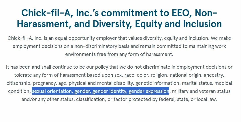 The funny thing about this is that DEI isn't even ‘cool’ anymore. Secular corporations are abandoning DEI in droves, including Ford, John Deere, Cracker Barrel, Lowe's, Toyota, Anheuser-Busch and many others. Why is Chick-Fil-A holding onto this nonsense?