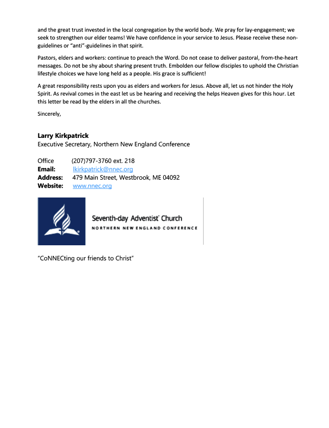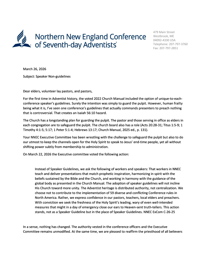 The Northern New England Conference, which is rapidly becoming the north star of liberty of conscience in Adventism, just released their non-guidelines for speakers.